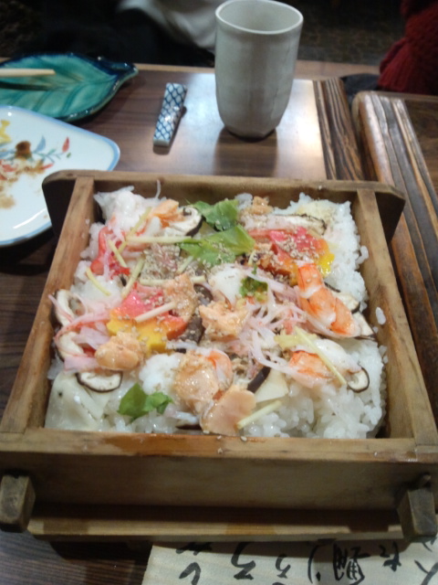 シャケやエビを乗せて蒸籠で蒸したご飯、